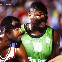 Y, por cierto, el de Sabonis no fue el único tablero roto. Exactamente en la siguiente edición tras el de Sabonis, apareció un combinado llamado San Marino All Stars, de jugadores estadounidenses reunidos por su agente, con la finalidad de promocionarles y “colocarles” en diferentes equipos europeos, práctica muy habitual en los 80. Patrocinados por empresas tabacaleras, incluso había periodistas invitados a sus giras -Paco Torres nos confirmó uno a Rimini, a gastos pagados-, para degustar de sus lindezas. Pues en este 1985 que nos ocupa, con jugadores como el NBA Ed Nealy, o los “españoles” Dan Caldwell o Bobby Lee Hurt, entrenados por John Betancourt, un tal Black, en el calentamiento del primer partido del Real Madrid, rompió el tablero que, esta vez sí estalló gran parte en pedazos. Hubo más de tres cuartos de hora de espera, los jugadores se dedicaron a estirar músculos y seguir calentando, mientras reponían el tablero. Y existe una foto adorable, donde Martín posa haciendo el tonto a la cámara fotográfica de Fernando Laura. “Para que veas el rollo que tenía yo con él. Me alegraba mucho. Eso, Fernando lo hacía con pocos”. Y uno de los directivos blancos, siendo entrevistado en televisión para que explicara el proceso de recambio del tablero, mostraba un mosqueo considerable, porque se trataba del tercer tablero roto en lo que llevaban de temporada. “En la historia del Real Madrid, tan sólo se había roto el de Sabonis. Y este año, llevamos ya tres” confesaba amargamente. Y es que, en aquella 85-86 fue cuando se instauraron en liga española los aros retráctiles que hay en la actualidad, toda una revolución en baloncesto. Entre otras cosas, para evitar aquella estupidez de pitar falta técnica a todo aquel que se agarrara del aro en un mate. Sin embargo, nadie reparó que los tableros convencionales no estaban preparados para, no el que alguien se colgase del aro, sino el impacto y la vibración que sufría el tablero cuando el jugador lo soltaba. Ahí estallaba con el consiguiente mosqueo del club blanco, entre otros.