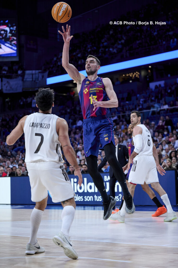 - Jugar “atacando” a Tavares. Fue de las primeras tretas que vislumbramos sobre el tapete en la matinal del domingo. El comentarista televisivo, Alex Mumbrú, explicaba muy nítidamente que los ataques azulgranas intentaban dejar el mayor aclarado posible, para que tres jugadores dejasen espacio al bloqueo y continuación, que fuese dentro de lo posible cosa de dos contra dos. ¿Por qué? Porque entre los dos defensores siempre intentaban involucrar a Tavares. De su movilidad y su respuesta, así los barcelonistas actuaban. Y Tomas Satoransky, veterano de mil guerras, usó su tiro de tres puntos con gran efectividad viendo a su defensor, Campazzo, que pasaba los bloqueos por detrás, por no dejar mucho espacio entre él y Tavares cuando este solía recular a proteger el aro (4 de 4 en triples). Fue un argumento que en momentos decisivos no supieron parar, desde el inicio marcando tal tendencia.