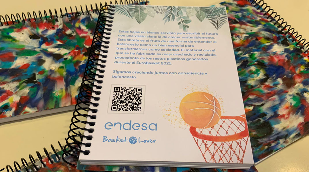 Los macroeventos deportivos son escenarios en los que en Endesa queremos prestar especial atención. Logística, publicidad, volumen de público… Todo tiene un impacto medioambiental que queremos revertir y reaprovechar para crear oportunidades. Por ejemplo, en el FIBA Womens Eurobasket 2021: a través de la recogida de residuos y su reciclaje, hemos dado una nueva vida a los materiales plásticos, convirtiéndolos en libretas para los Basket Lover.